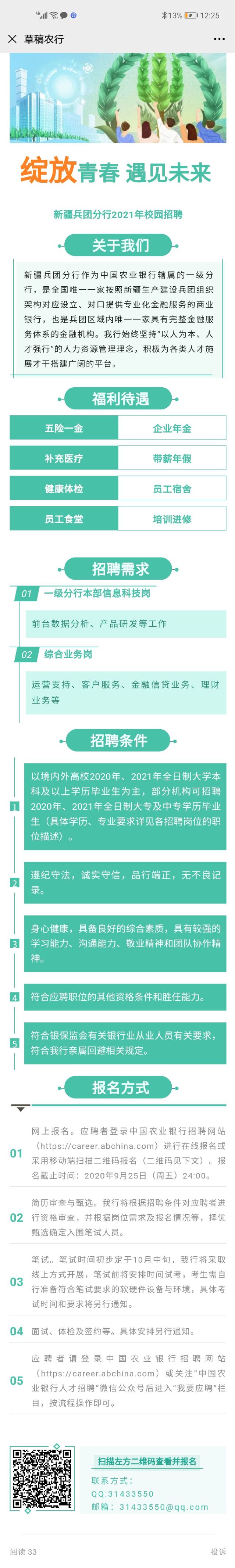 【校招速递】企业:中国农业银行新疆兵团分行时间:9月23日(周三)下午19:00请大家及时加入钉钉群@全体成员
