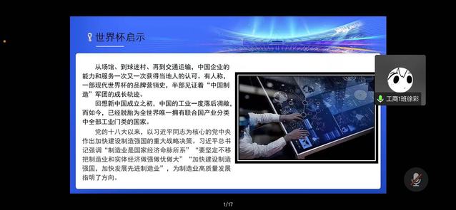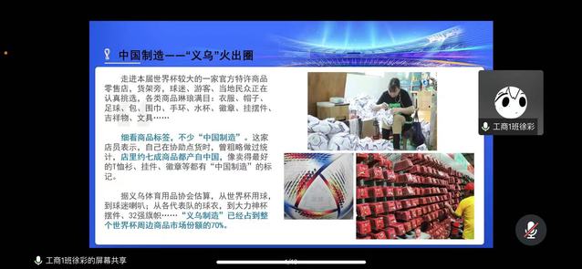 本次团课主讲人是工商类2021级第一团支部团支书徐彩,徐彩同学采用PPT以及视频的方式通过讲解卡塔尔世界杯的赛事文化、场地建设、比赛用品以及赛事周边产品来展现随处可见的“中国制造”,不仅让同学们重新领略了世界杯的魅力,也让大家了解到了世界杯中的中国贡献,“中国制造”乘着世界杯的东风,让世界感受到了中国自主创新的科技力量。