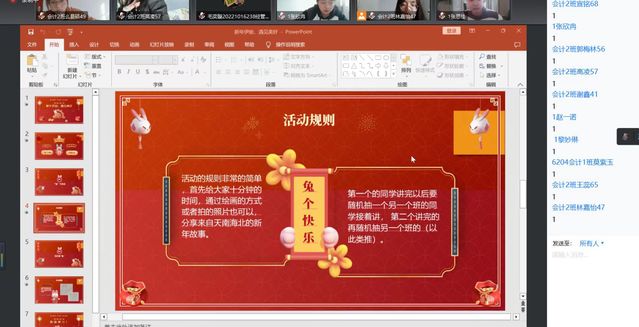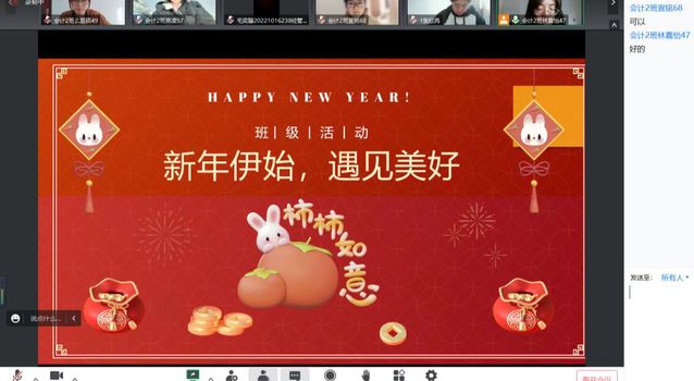 美好的时光总是短暂的,很多同学的分享无法一一被记录,但留给大家的感受是深刻的。宣铭同学说:“素未谋面,遍地各方。我们以互联网为媒介,连接彼此,分享各自的新年故事,每个人对大家都有了进一步的了解。我相信经过这次活动,两个班级,会是一个集体,未来,我们彼此帮助,协同共进。”