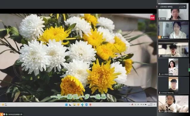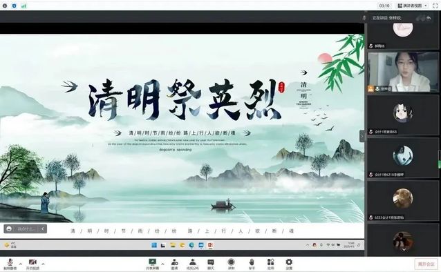 线上活动由团支书张梓欣同学主持,共分为三个环节。首先,张梓欣同学播放了一段清明节主题的视频,引出了清明节的节日渊源和活动目的。她说:“清明节是扫墓祭祖的时节。作为大学生,我们应当在清明之日缅怀英烈,祭奠英烈。传承民族传统,继承革命遗志。”