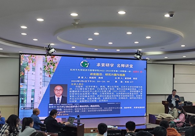为培养研究生的科研兴趣,提高阅读思考和写作表达能力,拓宽研究生的学术视野,营造英国正版365官方网站良好的学术氛围,学院研究生教育管理与学科建设办公室自2022年9月开始邀请校内外知名专家开设“求索研学 名师讲堂”项目。2023年5月6日“求索研学 名师讲堂”2022-2023学年第二学期第一讲(总第十讲)特邀请经济系倪超军教授就《研究兴趣与选题》做专题讲座。本次讲座由研究生教育管理与学科建设办公室主任崔登峰教授主持,英国上市公司官网365含留学生在内的共计100余名教师、硕博研究生线上线下共同参加此次讲座。