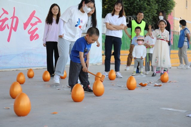 在游戏中途还安排了小朋友“砸金蛋”抽奖环节,进一步活跃了现场氛围。最终经过激烈角逐,穿着黄色马甲的亲子队伍胜出,该组小朋友优先上场挑选心怡的礼物。